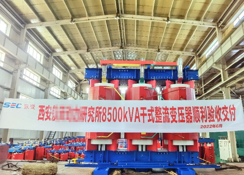 2022年7月1日,新環(huán)干變研制生產的8500kVA干式特種整流變壓器順利驗收交付。該產品服務于中國航天科技集團公司西安某研究所,在極端工況和特殊環(huán)境下對航天材料專用試驗設備,提供特種等級電壓、電流的專用整流變壓器。