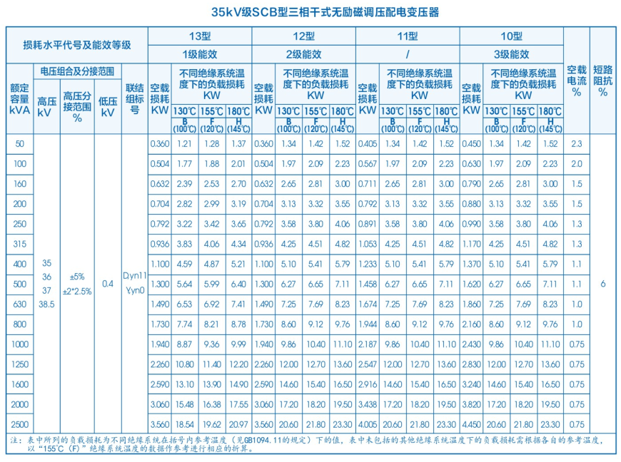 電壓等級(jí)35kV,變壓器容量30~20000kVA,該變壓器是我公司在消化吸收引進(jìn)技術(shù)的基礎(chǔ)上硏制開發(fā)的35kV級(jí)絕緣干式變壓器,產(chǎn)品的設(shè)計(jì)與制造均滿足IEC60076.GB1094.GB/T10228等標(biāo)準(zhǔn)的要求,產(chǎn)品將35kV電網(wǎng)電源直接降低為400V配電電源或10kV輸電電源為用戶供電。具有顯著優(yōu)點(diǎn),為越來越多的工程所采用。